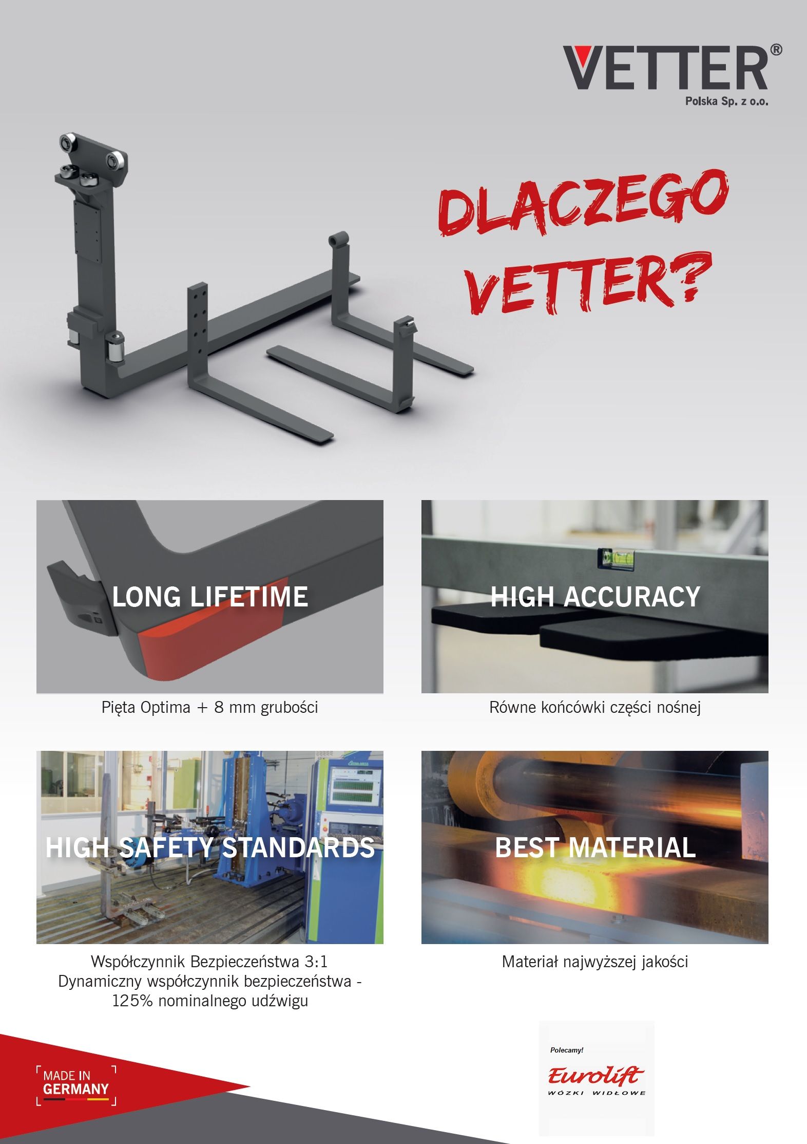 VETTER od prawie 30 lat jest czołowym europejskim producentem wideł najwyższej jakości i dostawcą wielu poważnych producentów wózków widłowych. Inżynierowie firmy VETTER rozwinęli znany sposób ugięcia wideł pod nazwą OPTIMA. Wzmocnione ugięcie gwarantuje najwyższą wytrzymałość, długą żywotność i możliwość ekstremalnych ugięć. Firma VETTER jest pierwszym producentem wideł z wprowadzonym systemem zarządzania jakością według normy DIN EN ISO 9001, certyfikowanym przez Lloyd's Register (LOQA) w Londynie.